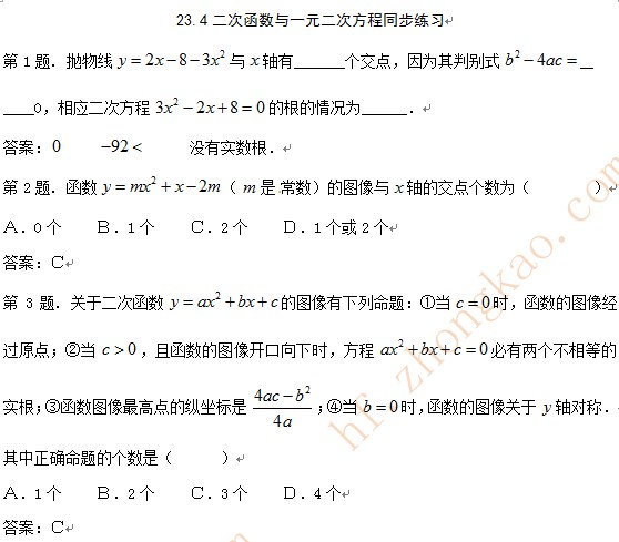 合肥中考网9月3日:沪科版数学九年级《二次函数与一元二次方程》同步练习
