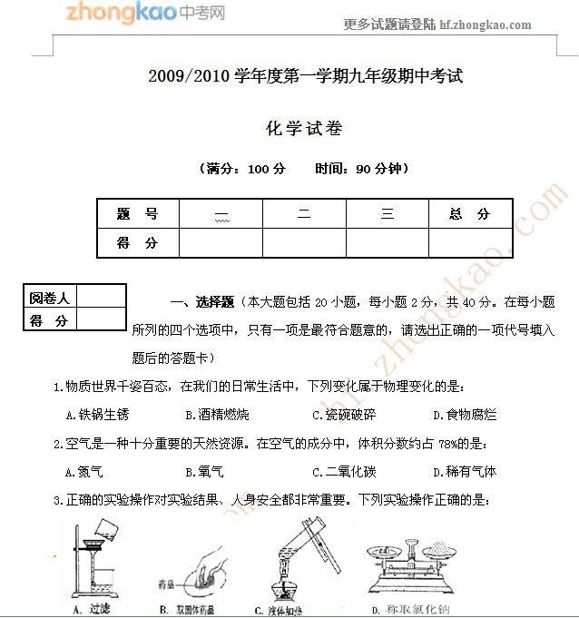 | 《合肥三十八中09~10学年九年级上学期期中考试化学卷》 |