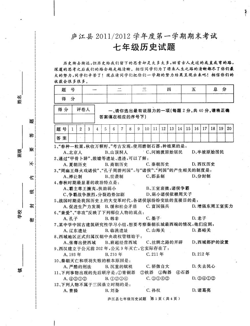 | 《庐江县2012届七年级上期末考试历史试题》 |