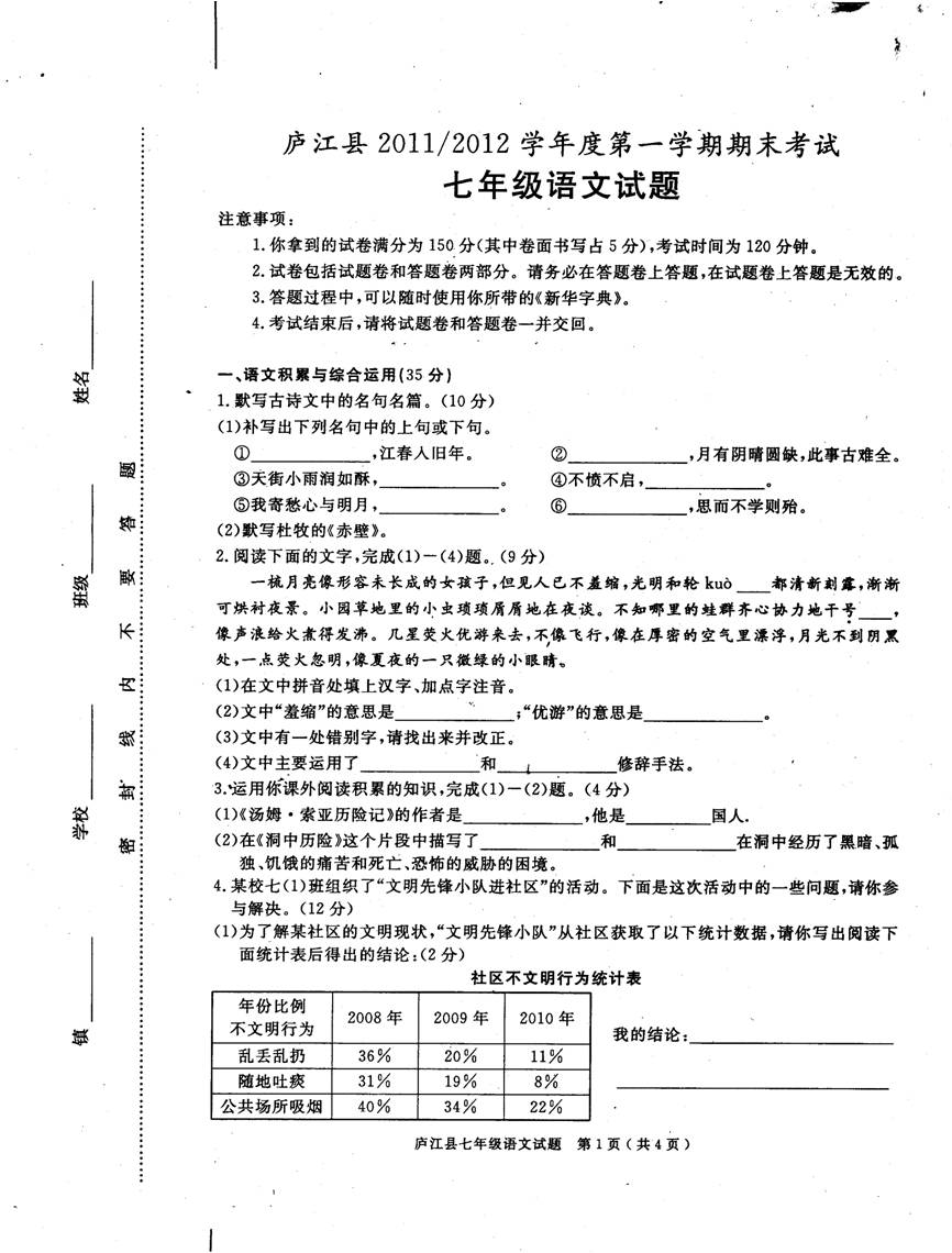 | 《庐江县2012届七年级上期末考试语文试题》 |