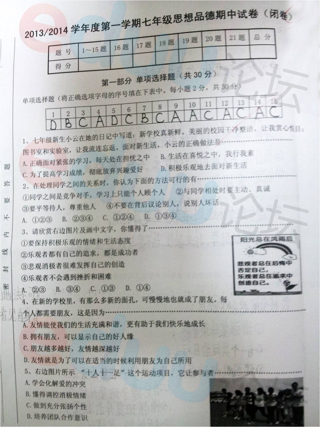 试题下载地址:2013-2014学年度上学期合肥包河区七年级期中考试思品卷