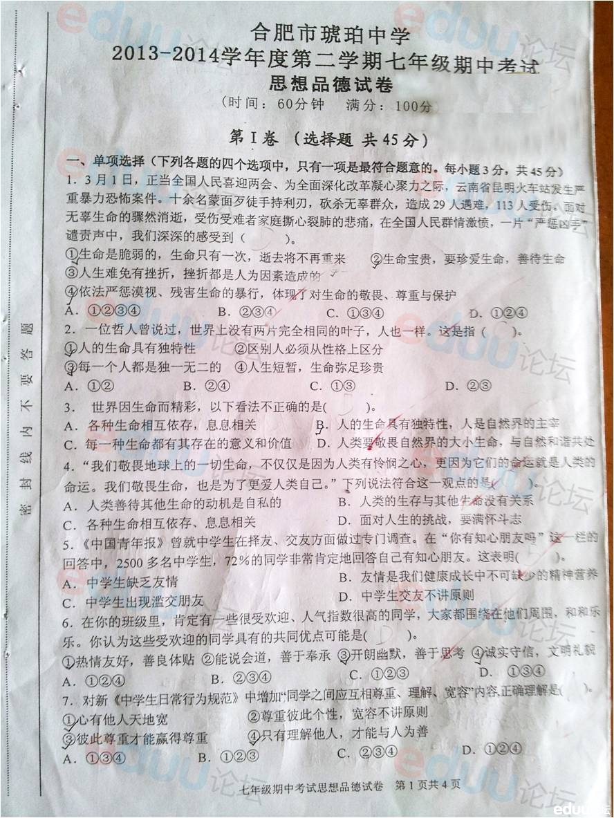 2013-2014学年度第二学期合肥琥珀中学七年级期中考试政治试卷