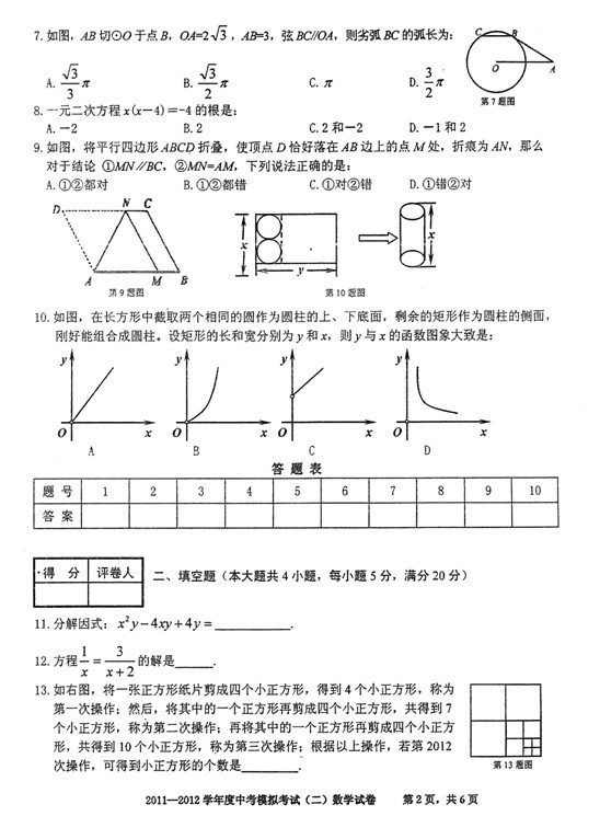 2012年合肥二模瑶海区数学试卷及答案(2)