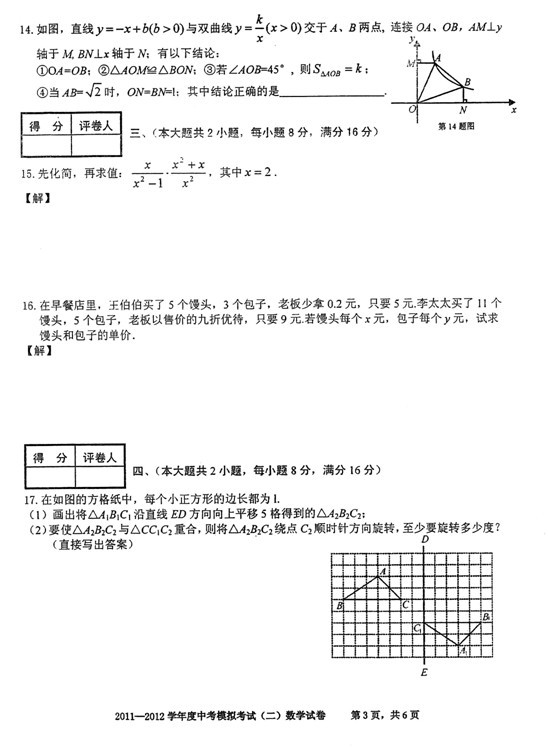 2012年合肥二模瑶海区数学试卷及答案(3)