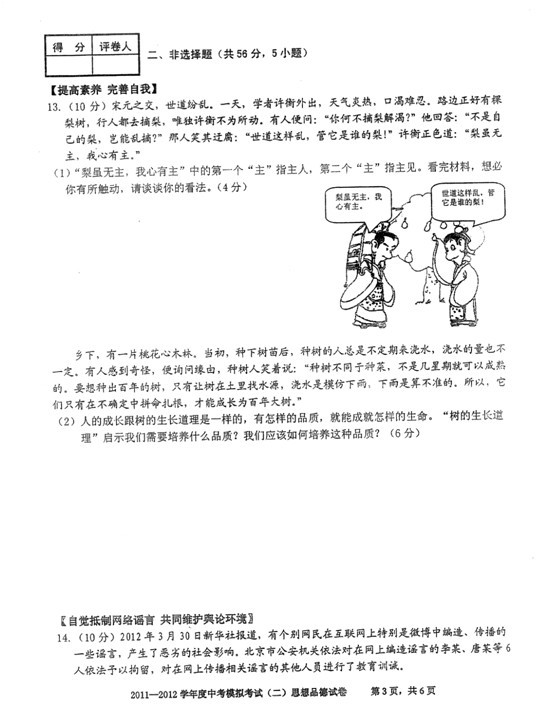 2012年合肥二模瑶海区思想品德试卷及答案(3)