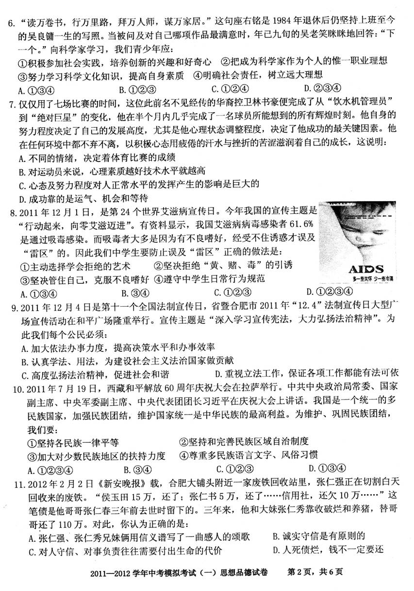 2012年合肥一模瑶海区思品试卷及答案(2)