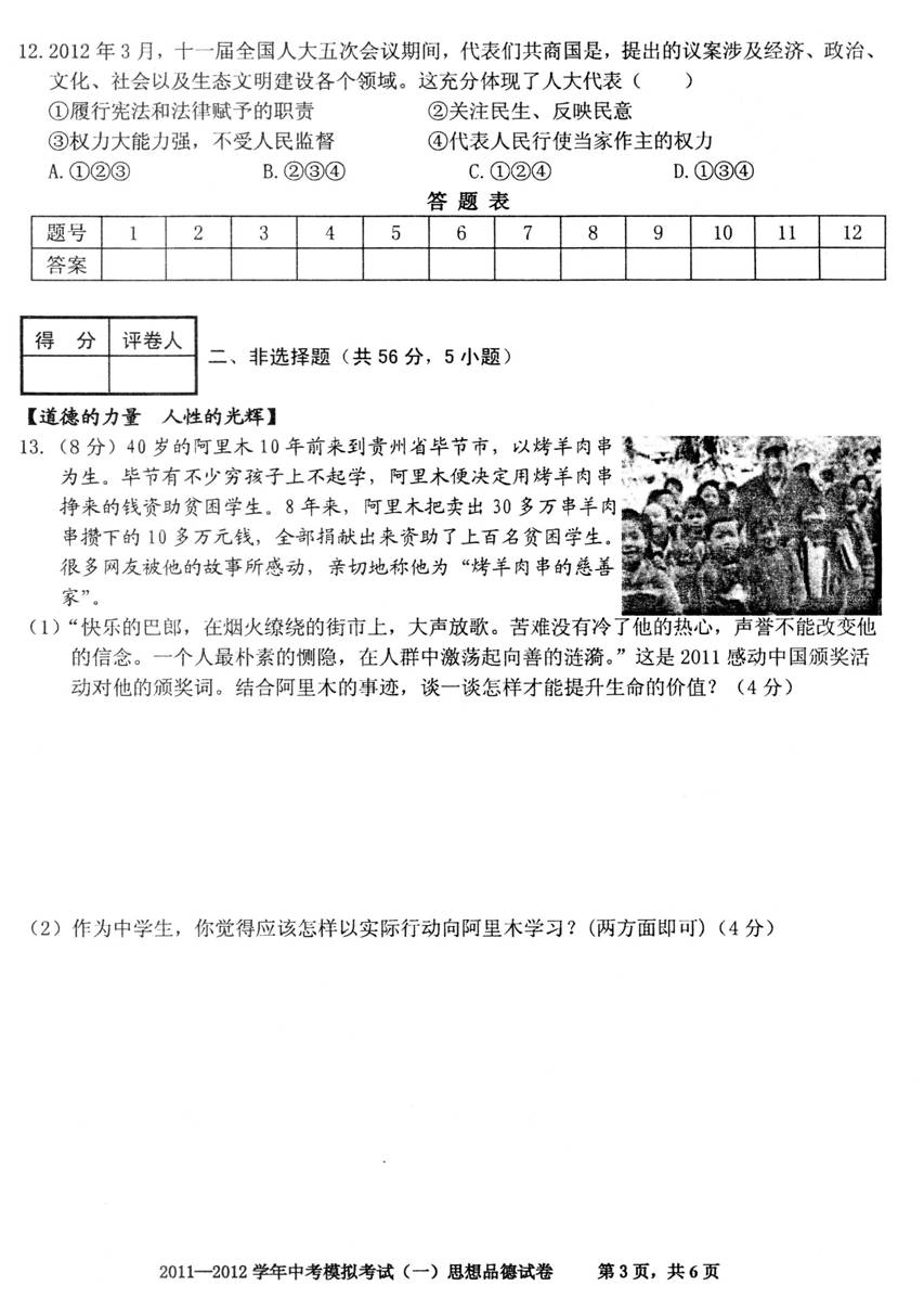 2012年合肥一模瑶海区思品试卷及答案(3)