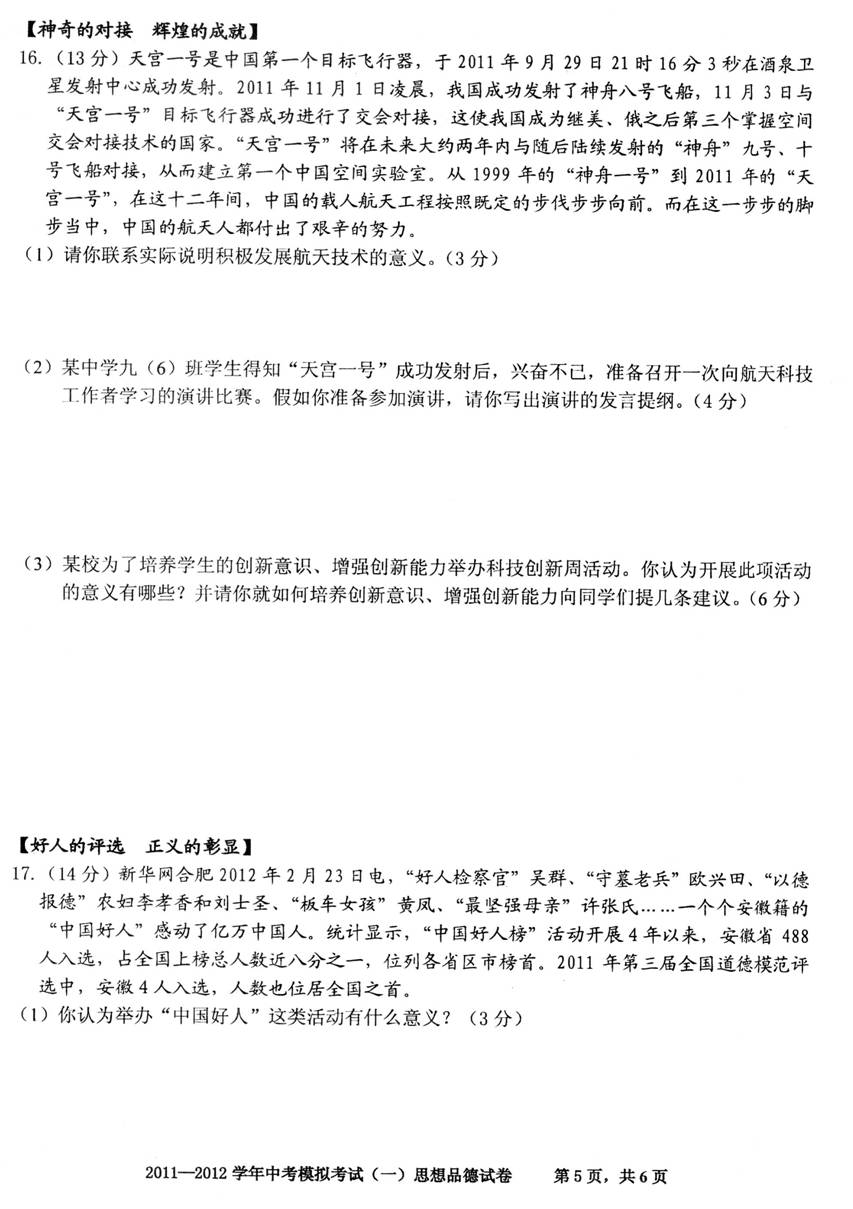 2012年合肥一模瑶海区思品试卷及答案(5)