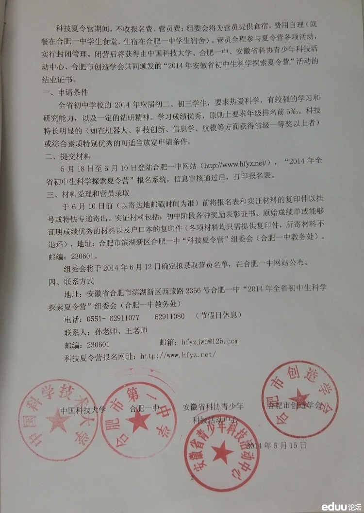 合肥中考网讯:昨日,合肥一中公布了2014年安徽省初中生科学探索夏令营报名时间和报名条件。今年跟去年相同,成绩优秀的初二初三考生均可报名参加。 【查看原帖并参与讨论:2014年安徽省初中生科学探索夏令营开营】