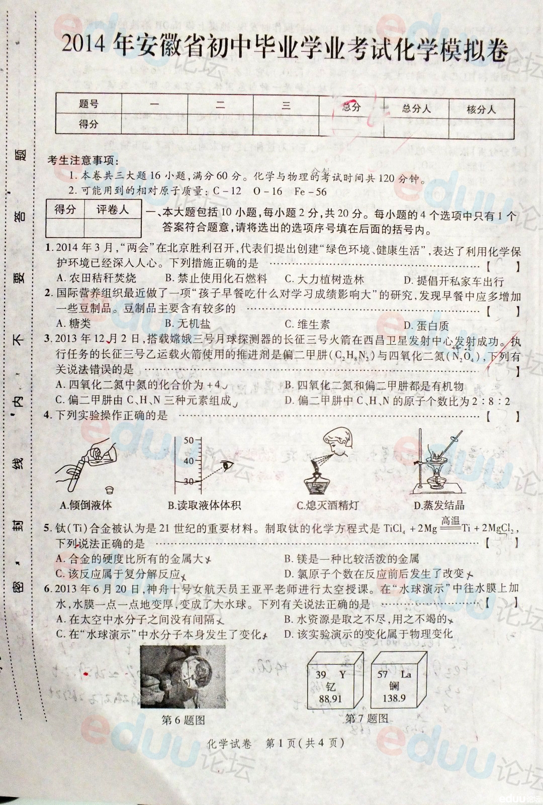 【查看原帖并参与讨论:2014年合肥中考二模瑶海区化学试卷】