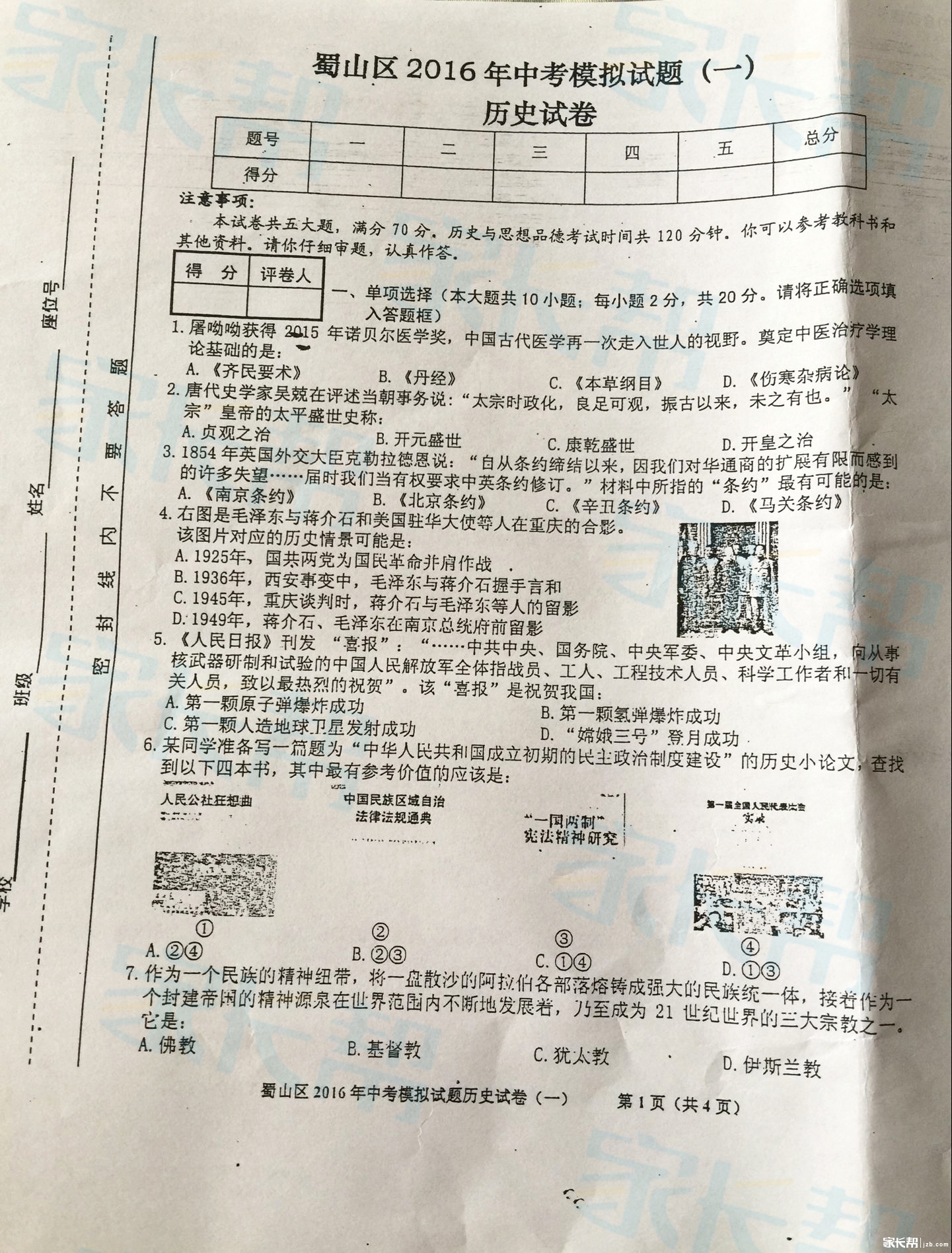 2016年合肥中考蜀山区一模历史试卷: