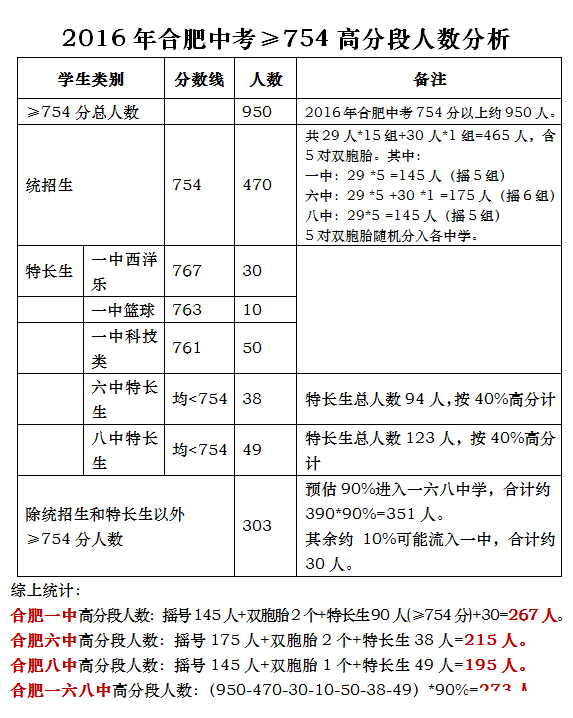 2016年合肥中考754分以上录取情况分析