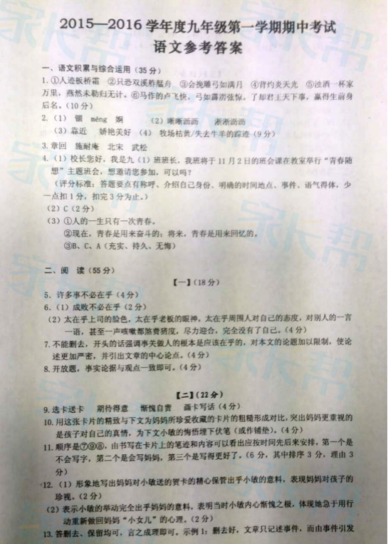 2015-2016学年合肥瑶海区九年级期中考试语文试题答案