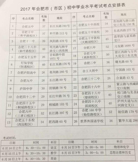 2017年合肥初中学业水平考试考点安排公布