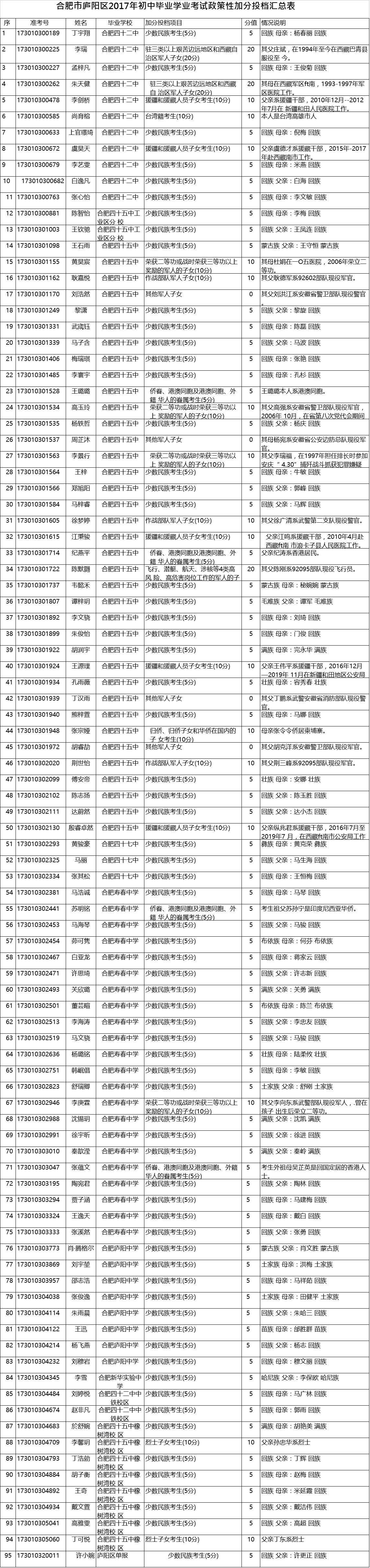 2017年合肥庐阳区中考政策性加分公示名单