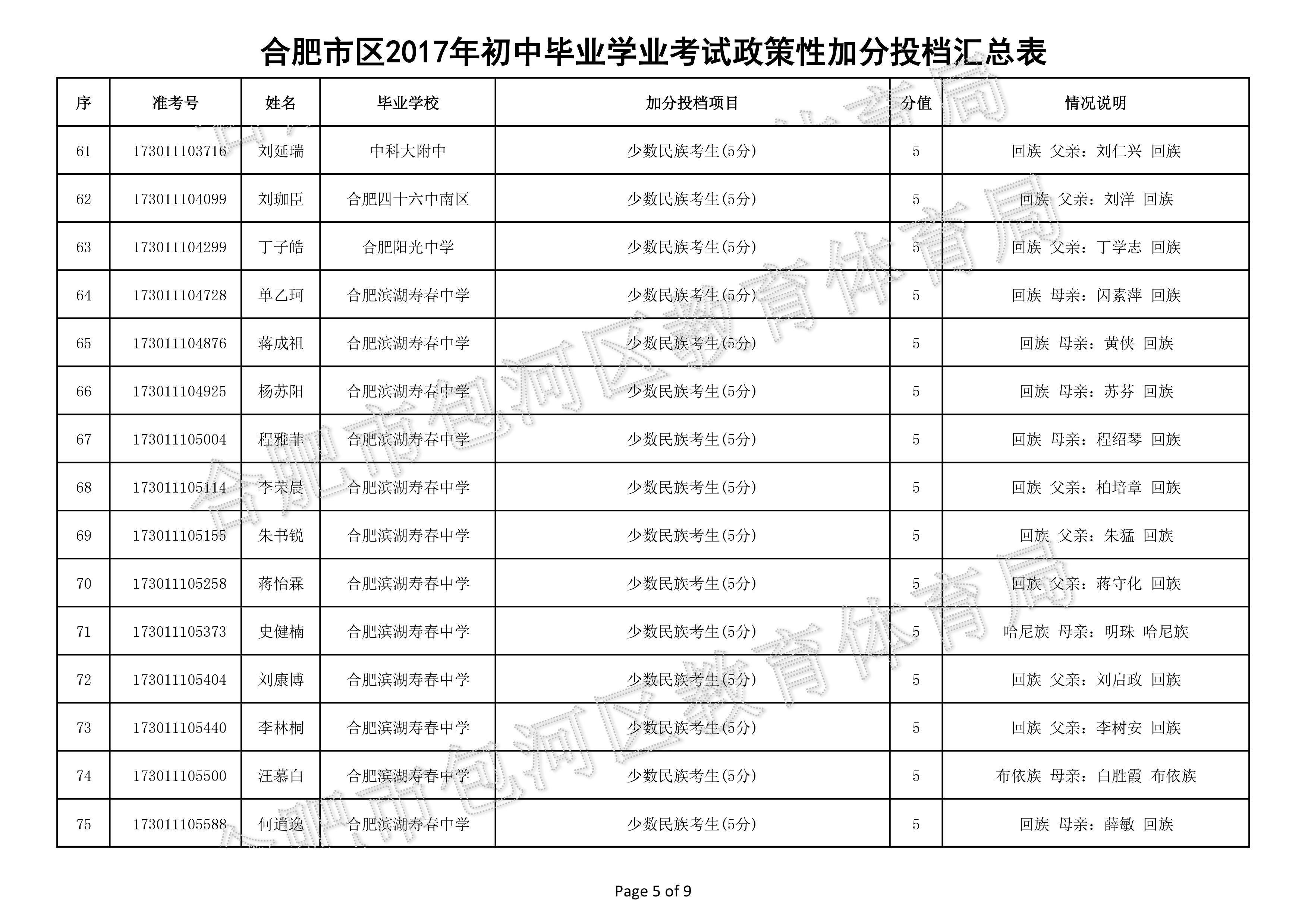 2017年合肥包河区中考政策性加分公示名单(5)