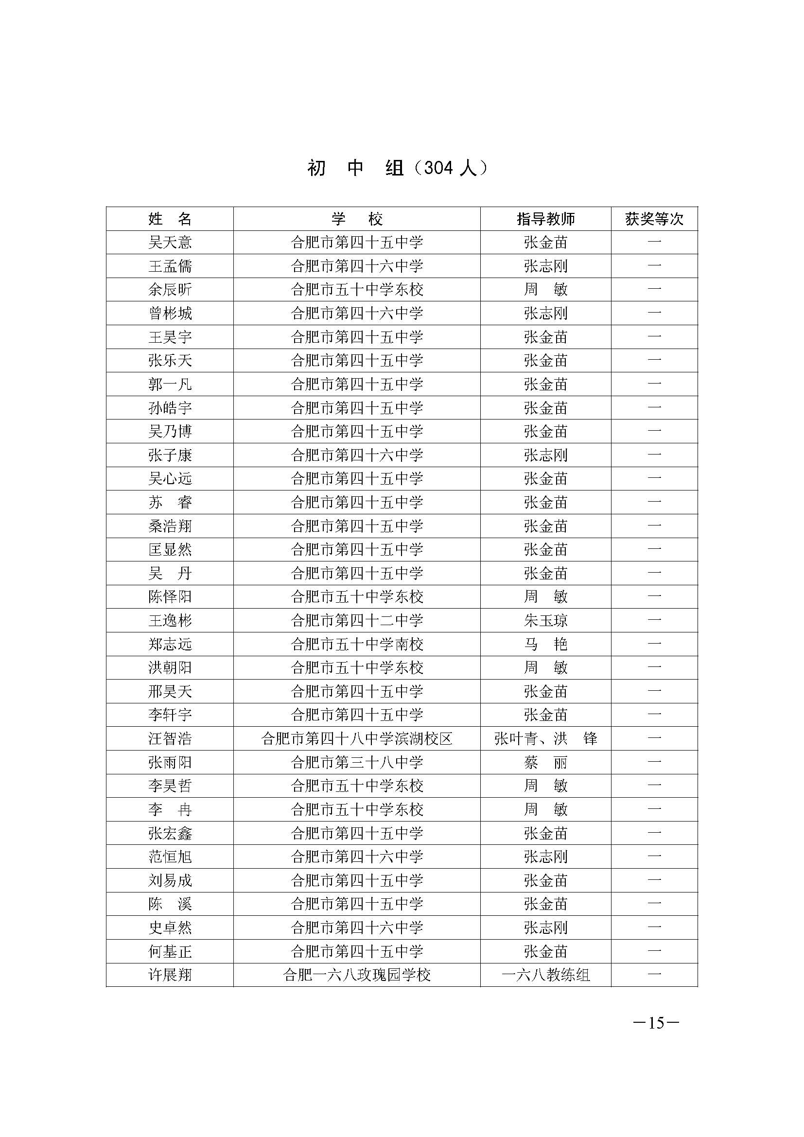 合肥市第34届青少年信息学竞赛获奖名单(初中组)