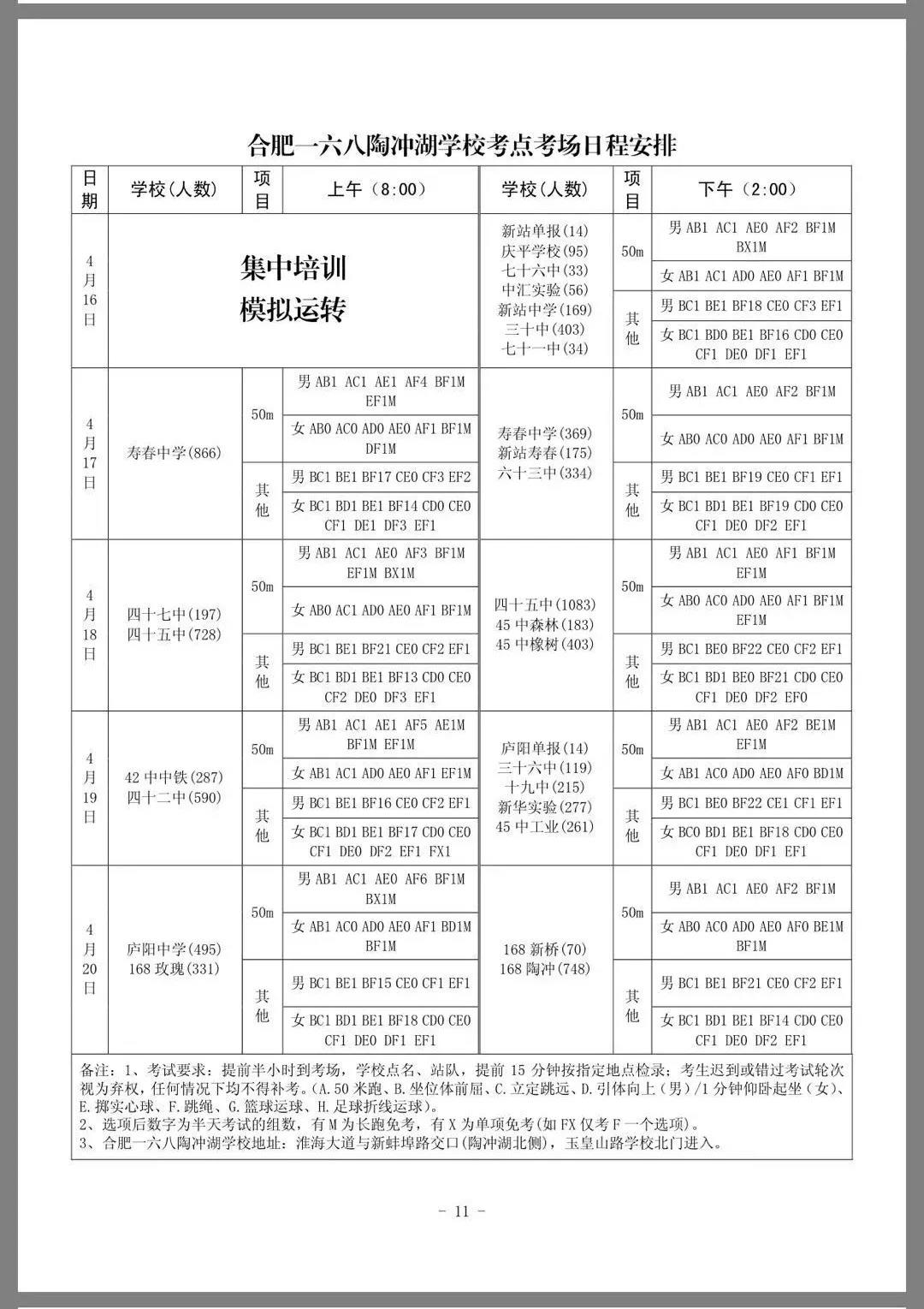 2018年合肥一六八陶冲湖中考体育考点考场日程安排